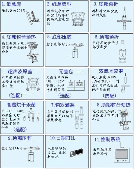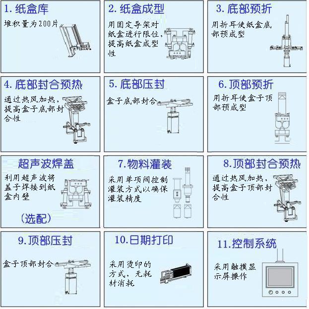 屋頂盒紙盒片→人工上盒→底部加熱壓封成型→開口紙合→超聲波焊接加蓋→開口加蓋紙盒→人工放盒至軌道→灌裝→頂部封合成型→打印日期→屋頂包產(chǎn)品